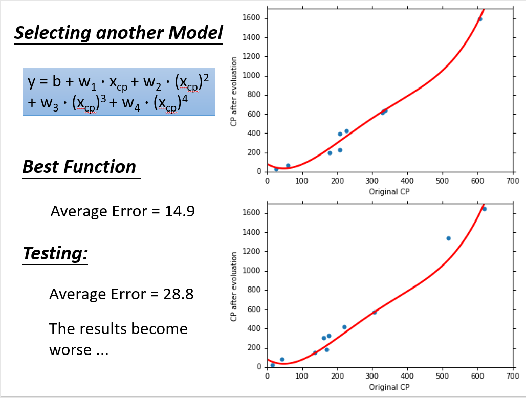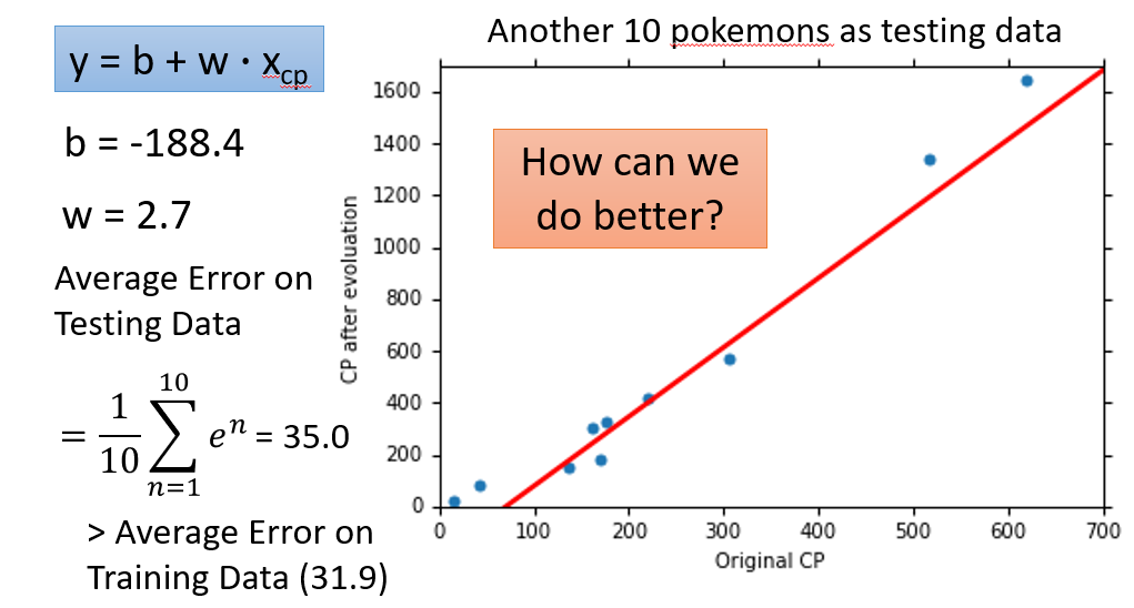当我们使用梯度下降的方式找到那个看似最好的函数之后,我们还需要验证这个函数在同类型的别的数据集内运行的效果如何。例如上文的模型中,训练完毕后我们会再使用10组Pokemons的数据测试模型,以反映该模型真实的拟合水平。