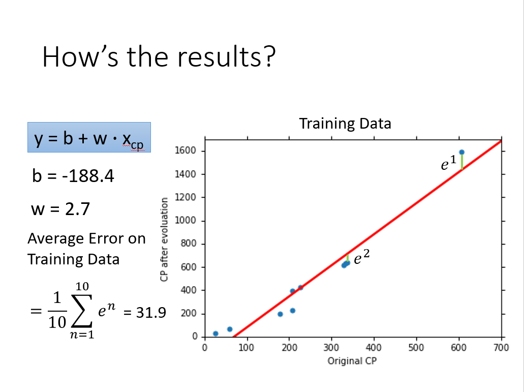 接着,又把Pokemon的weight、height、HP的影响都考虑了进去,得到了一个参数很多的函数。加上去之后,由于参数量增多,又导致了过拟合,效果又不太好了。