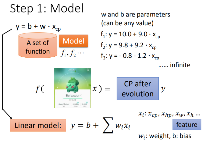 图中的例子就是一个多元线性模型,每一个Pokemon的进化前的CP值、物种(Bulbasaur)、血量(HP)、重量(Weight)、高度(Height)等都属于要输入的特征,由于是多个特征,所以我们选取多元线性模型。在考虑的过程中我们会把输入输出数据转化成相应的矩阵形式,以便于模型的训练。