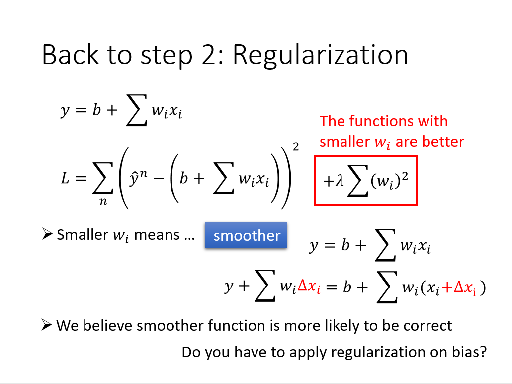这里在损失函数中加入了正则项,使模型在训练的时候可以降低 w 的值,b 的值接近于0 ,对曲线平滑是没有影响,所以这里没考虑。