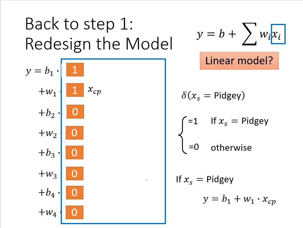 课程中对这个隐藏因子做了处理,重新设置了模型,设计的思路就是对于不同的Pokemon,函数的参数会有所不同,如图:
