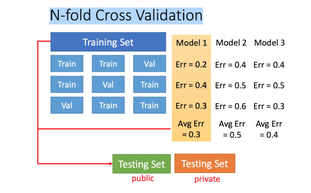 由于上面分析到的原因,我们直接使用训练集训练模型,然后使用测试集来测试,得到的结果很可能在真实的数据集上不那么work。这里我们提出两种新的方法来验证究竟哪个模型是我们最需要的。一是交叉验证法,我们把训练集中的数据拿出一部分用来作为验证集,剩下的作为训练集跑出几个模型,然后在验证集上找到表现最好的,再把验证集和训练集合并成训练集训练一下表现最好的模型。最后得到的模型就是我们要的。(就算此时模型表现得不是很好也不推荐回头再调了);二是N折交叉验证,这里我们会把训练集分为N份,然后每份都要做一次验证集,剩下的做训练集,这样每个模型都会跑N次,最后每个模型的表现取平均值,选取效果最好的那个。