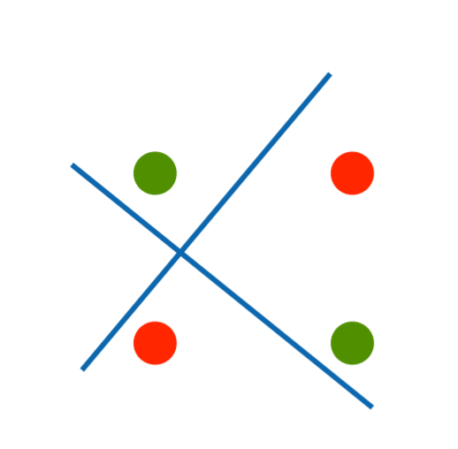 从感知机的数学模型可以直观看出,感知机无非是用一条直线做分类,当出现下方的问题时,一条直线根本无法对数据进行分类: