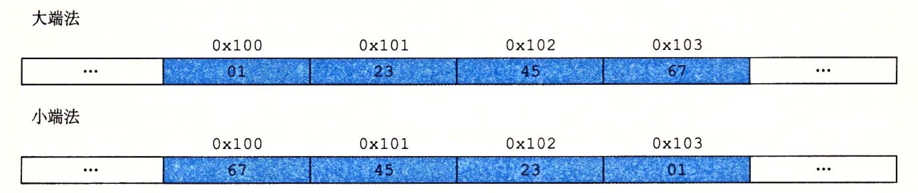 当我们面对跨越多字节的程序对象,如C语言中的数组,我们要明确两个东西:这个对象的地址是什么,以及在内存中如何排列这些字节。在几乎所有的机器上,多字节对象都被存储为连续的字节序列,对象的地址为所使用字节中最小的地址。例如,假设一个类型为int的变量 x 的地址为0x100,也就是说,地址表达式 &x 的值为0x100。那么,(假设数据类型int为32位表示) x 的4个字节将被存储在内存的0x100、0x101、0x102 和0x103 位置。